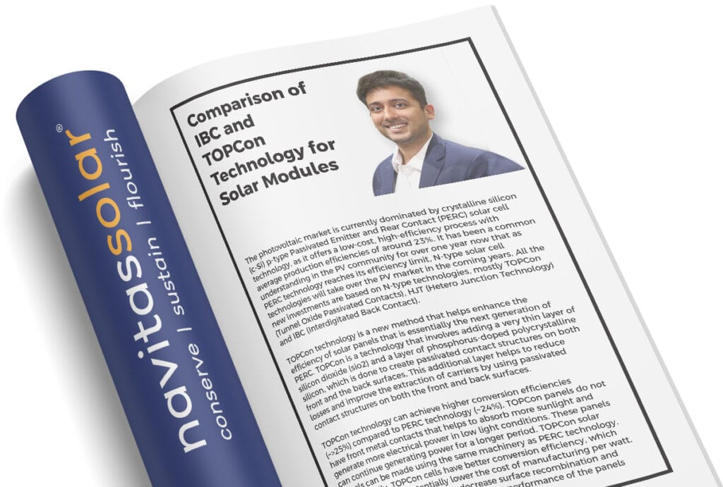 At, Navitas Solar, a leading module manufacturing company with the capacity of 1.7 GW p.a. we believe that both the IBC and TOPCon solar cell technologies will greatly change the solar panel industry in upcoming time. We at Navitas Solar will be manufacturing N-type TOPCon modules up to 20 bus bars with power generation capacity of 720 watts per panel. N- Type TOPCon Bifacial panels will be the choice of consumers in the upcoming future. Both the technologies have the potential to improve efficiency and make solar energy more widely available and sustainable. IBC panels are especially known for their superior performance and commercial viability in high temperature conditions while TOPCon panels have higher efficiencies and can offer potential cost savings.