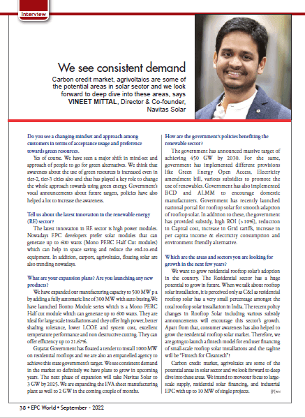 Mr. Vineet Mittal, Director & Co-Founder, Navitas Solar is featured in an interview published by EPC World Magazine – 2022